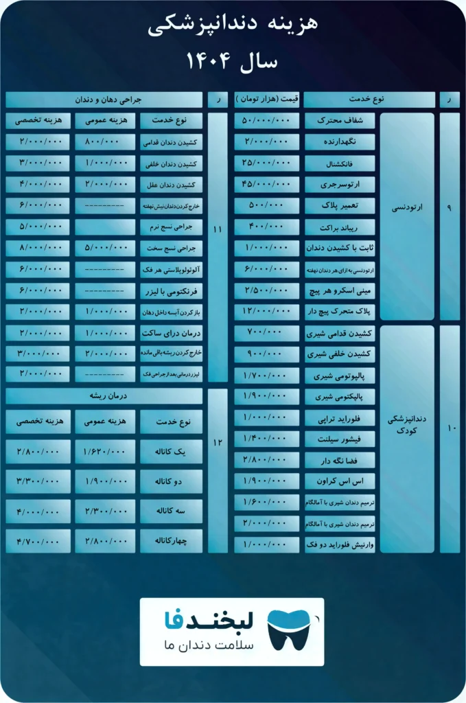 هزینه دندانپزشکی یکی از دغدغه های مهم بسیاری از افراد است که متاسفانه هر چند ماه یک بار نیز تغییر کرده و افزایش می یابند. افزایش هزینه ها و این مساله که اغلب هزینه های مربوط به دندانپزشکی بر عهده خود بیمار است، می تواند فشار مالی زیادی را به بیماران وارد کند. با این حال، با بررسی دقیق و مقایسه هزینه ها در کلینیک های مختلف، می توان پیش از شروع درمان، یک مرکز دندانپزشکی منصف و متناسب با بودجه خود را پیدا کرد. این تحقیق و بررسی نه تنها به صرفه جویی در هزینه ها کمک می کند، بلکه اطمینان از دریافت خدمات با کیفیت را نیز به همراه دارد. با لبخندفا همراه باشید تا با تعرفه دندانپزشکی 1404 آشنا شوید.